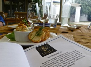 We rijden wat rond langs de wijngaarden en lunchen op de Coney Winery. De dochter des huizes voorziet ons van een tasting aan onze tafel.